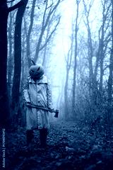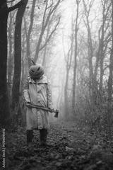 Haunting scarecrow with axe and carved pumpkin head stands still in misty autumn forest. Tattered cloak and fog add to the eerie Halloween scene and horror vibe