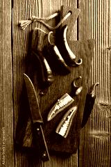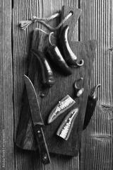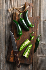 Black jalapeno with knife on rustic wooden cutting board close up. Green mexican jalapeno hot peppers