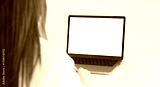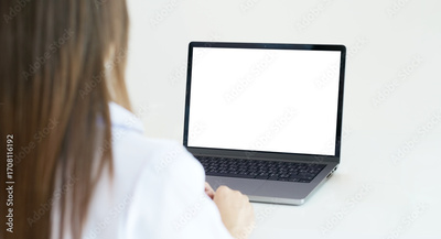 Laptop computer screen mockup, template background banner, Woman hand typing laptop computer with blank screen, Business online, e commerce, online study concept