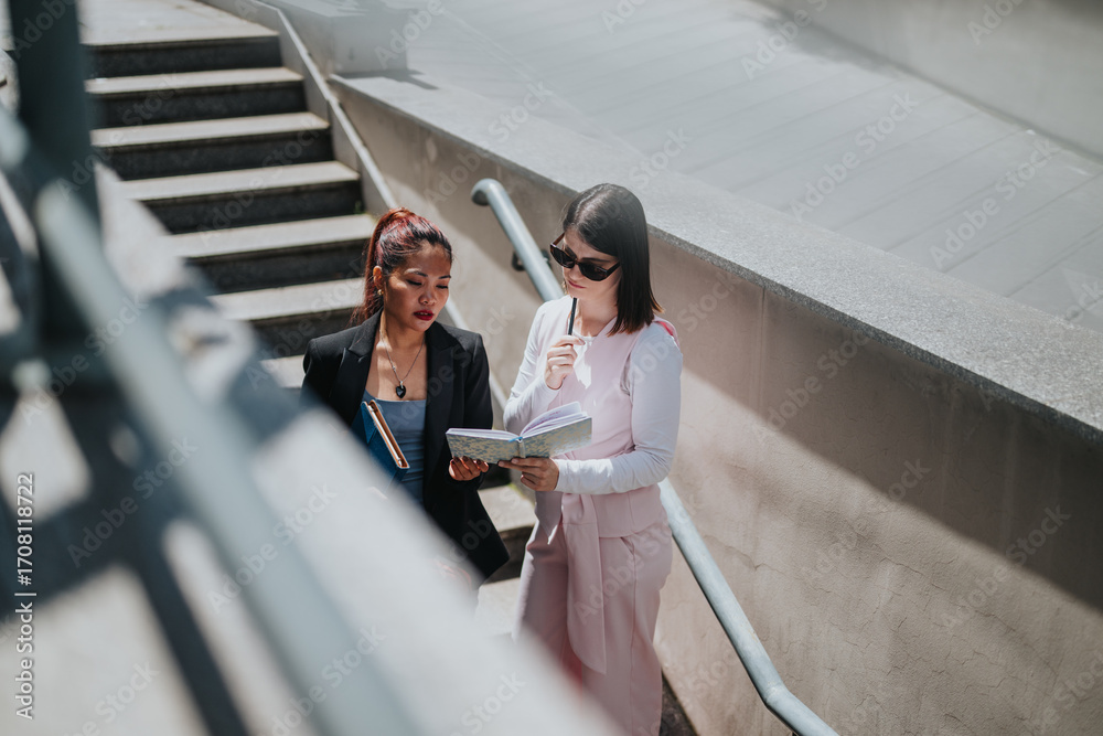Two individuals engaging in a business-related discussion with documents in hand on a sunny day.