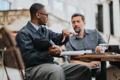 Business people are conversing passionately in an outdoor setting, exchanging ideas and strategies. The interaction emphasizes collaboration, and communication in a formal yet relaxed atmosphere.