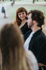 A joyful outdoor gathering of adults engaging in friendly conversation, sharing smiles and laughter. The scene captures the warmth of a casual social setting in a relaxed park.