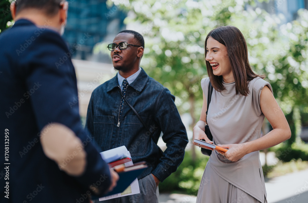Three colleagues talking and smiling outdoors in a professional and relaxed atmosphere.