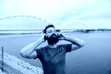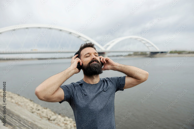 Bearded Man Wearing Sportswear Relaxes Outdoors Listening to Music Near a River Bridge
