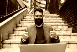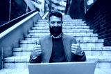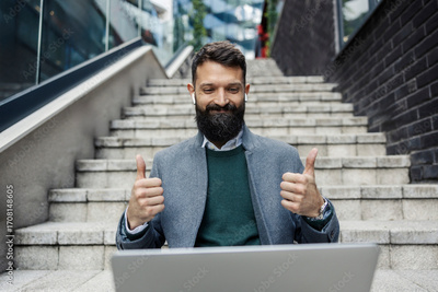 Portrait of successful businessman sitting on staircase on a city street and giving thumbs up at the laptop during conference call.