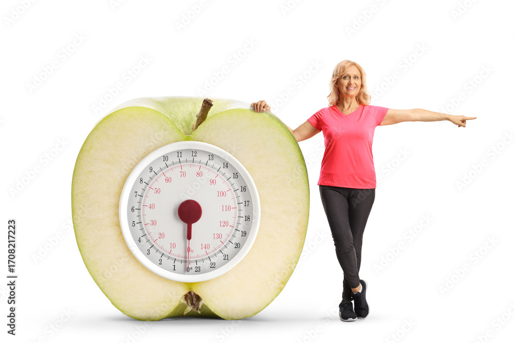 Full length portrait of a mature woman in sportswear posing next to an apple measuring scale and pointing