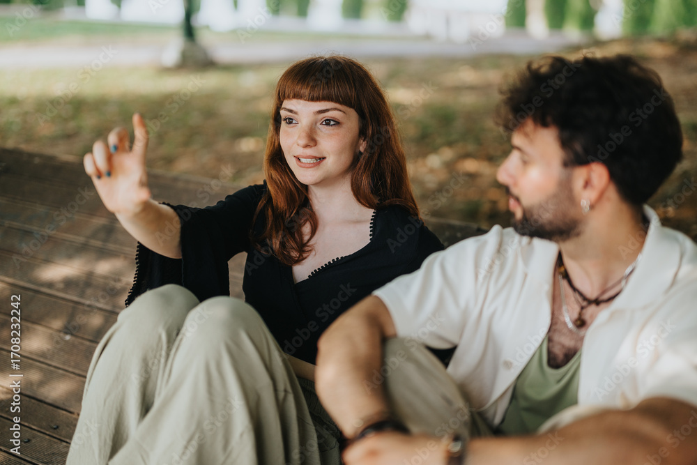Two adults are sitting on a wooden bench in a park, engaging in a lively conversation. The lush greenery and natural outdoor setting create a warm and friendly atmosphere.