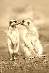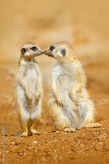 Animal love, kiss in nature. Animal family. Funny image from Africa nature. Cute Meerkat, Suricata suricatta, sitting on the stone. Sand desert with small mammals. Meerkat from Namibia, Africa.