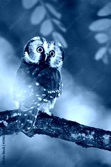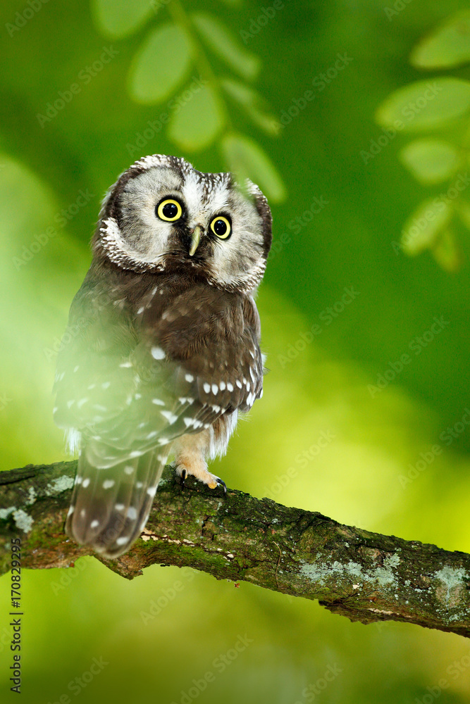 Boreal owl, Aegolius funereus, sitting on the tree branch in green forest background. Owl hidden in green forest vegetation. small Bird in nature. Wildlife of Sweden.