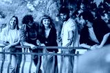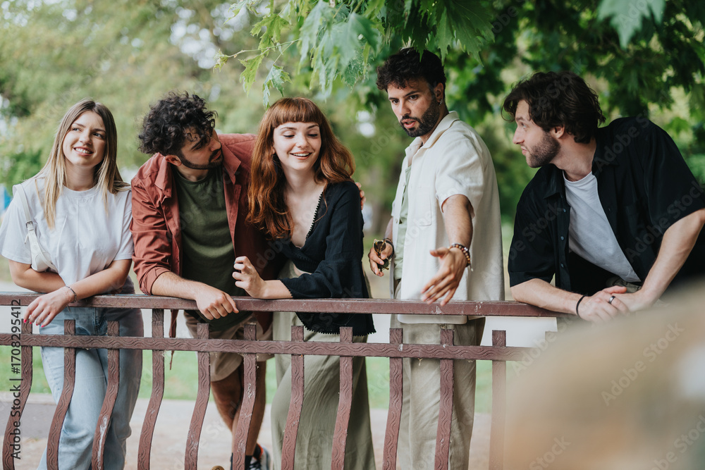 A group of young adults gathers on a wooden bridge surrounded by lush greenery, enjoying friendly conversation and a relaxed atmosphere, depicting togetherness, friendship, and the beauty of nature.