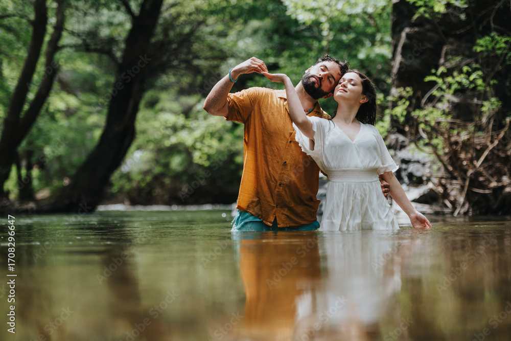 A couple embraces gracefully in a tranquil forest stream, embodying connection, romance, and harmony with nature on a bright summer day.
