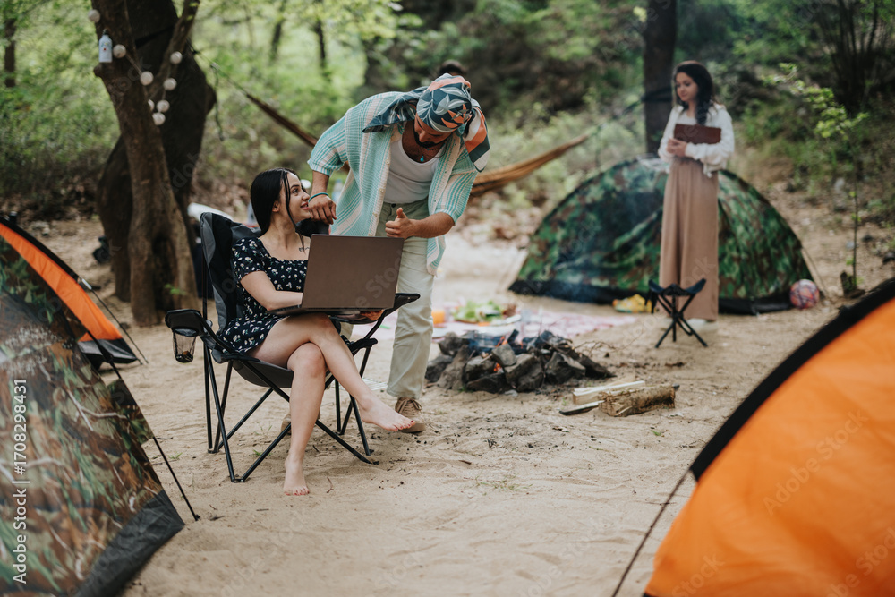 A group of friends during a camping trip, gathered around tents and a fire. They are enjoying outdoor activities, relaxation, and each other's company in a serene natural setting.