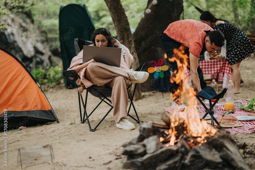 A group of friends unwinds in nature, gathering around a campfire while camping outdoors. One uses a laptop, creating a mix of relaxation and productivity amid the scenic surroundings.