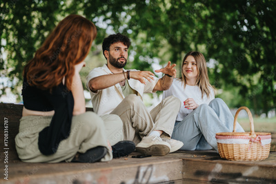 Three friends sitting together on wooden steps in a park, chatting and laughing. A picnic basket is nearby, suggesting a relaxed day outdoors bonding and sharing enjoyable moments.