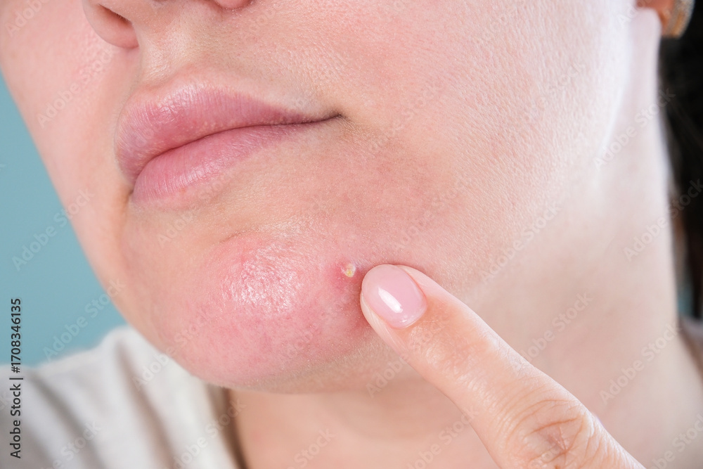 A woman points her finger at a purulent pimple on her face.