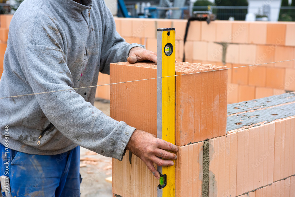 Der Rohbau von einem Wohnhaus im Neubau wird mit Ziegelsteinen gemauert, als Symbolbild für Wohnungsbau und Wohnpolitik