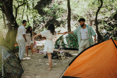 Friends spending quality time outdoors, camping in nature, and enjoying each other's company by the fire.