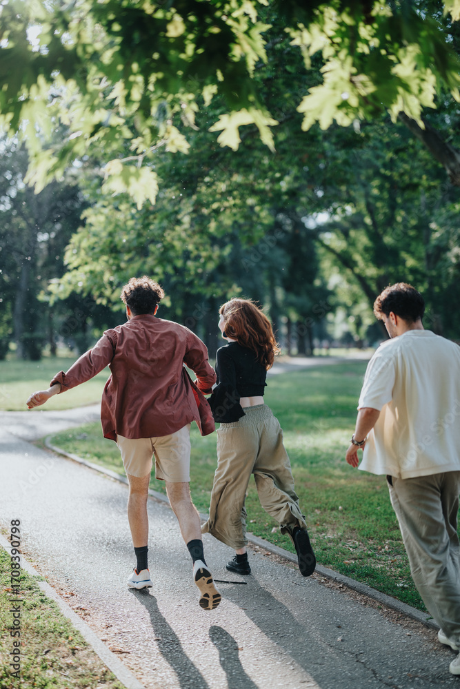 A group of young friends walking joyfully along a path in a green park, experiencing a tranquil and fun shared moment in the midst of nature during a sunny day.
