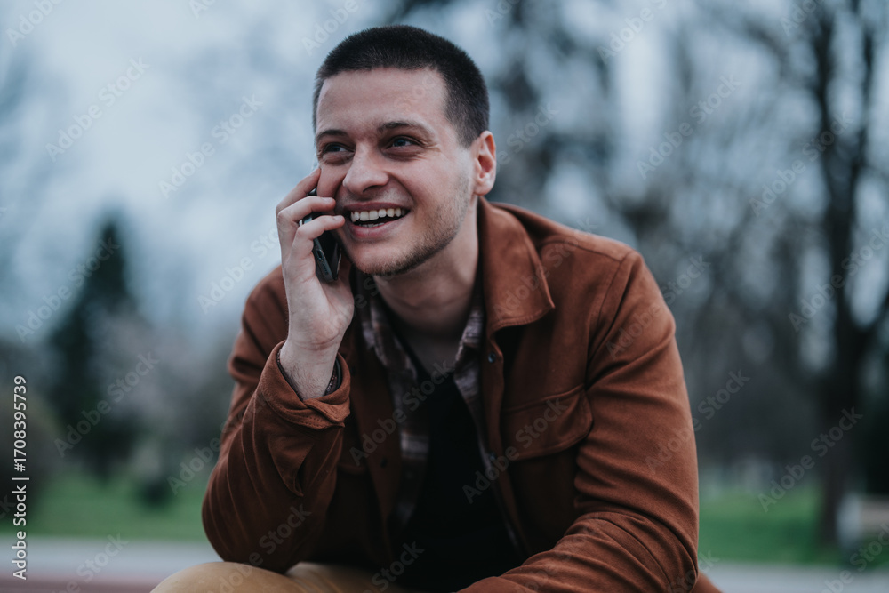 A cheerful young man is having a phone conversation while enjoying time in a park. The image captures a casual moment of happiness and connection with a natural and relaxing backdrop.