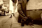 Man dressed in formal gray pants and black shoes stands near a wall with a casually parked scooter in an urban setting on a sunny day.