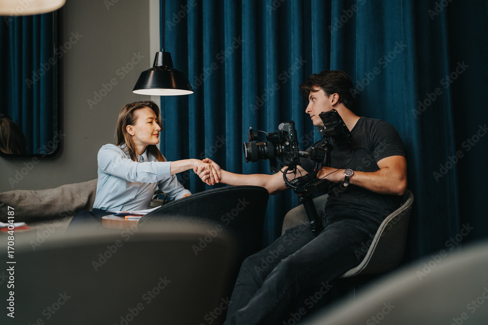 A professional meeting where business associates greet and discuss a project setup.