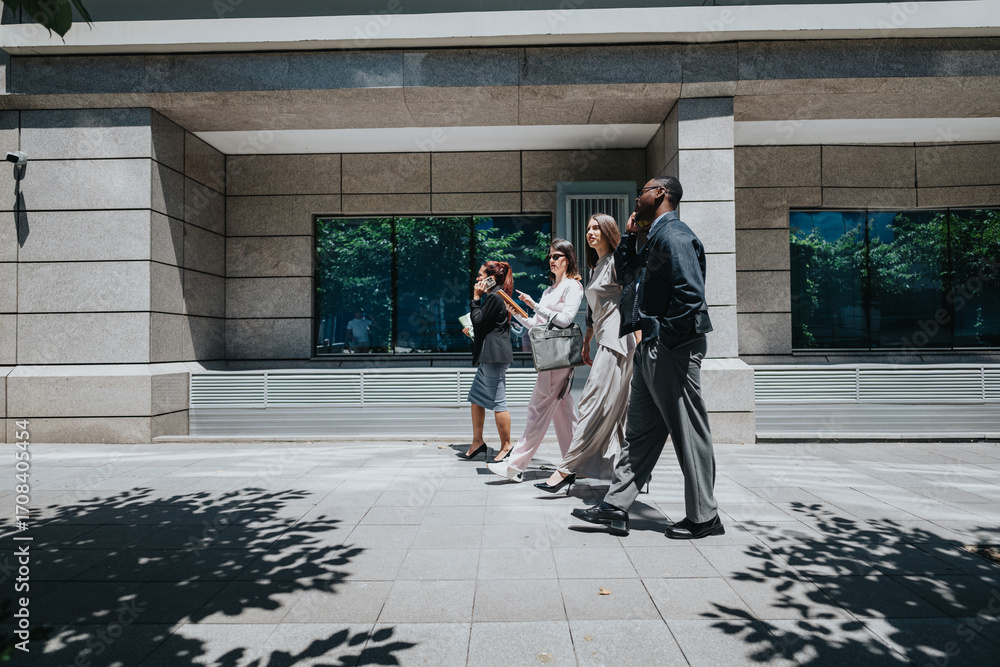 Multi ethnic colleagues walking in coordination, promoting professionalism and collaboration. The scene conveys teamwork, modern business culture and diversity within a professional urban environment.
