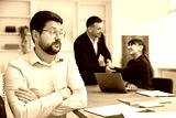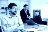 Man feeling jealous of his successful colleague receiving congratulations in office, selective focus