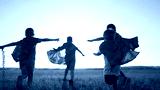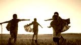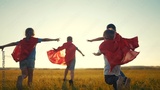 team of kids superheroes run. happy family kid concept. a group of children playing superheroes in capes and masks run through the grass at sunset. success business striving for goal dream concept