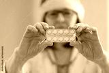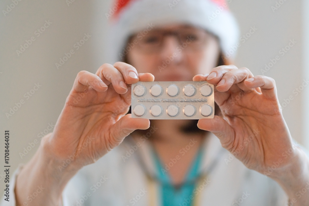 Close-up of female doctor in white uniform and Santa hat, holding pills forward. Focus on medication, health care, treatment for cold and flu during festive season. Winter illness, holiday recovery.