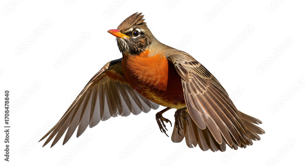 Isolated American robin flying midair, vibrant orange chest, elegant brown wings and plumage