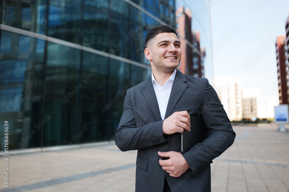 Smiling businessman puts away his cell phone near office buildings