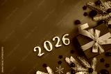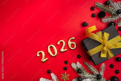 Christmas and Happy New year 2026 with black and red glitter decorations on red bright background. Holiday party decoration . Christmas celebration, holiday card