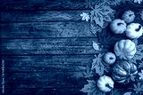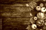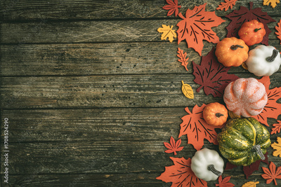 Autumn composition with decorative pumpkins, sunflowers, and felt leaves on rustic wooden background. Perfect for Thanksgiving invitations, seasonal banners, and fall-themed designs.