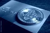 Bitcoin and plastic bank card on wooden table, closeup