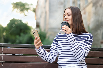 Coffee to go. Woman with paper cup of drink and smartphone on bench outdoors