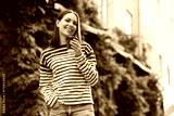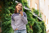 Coffee to go. Woman with paper cup of drink outdoors, space for text