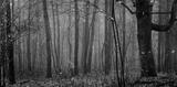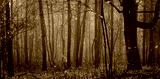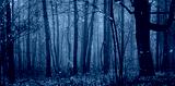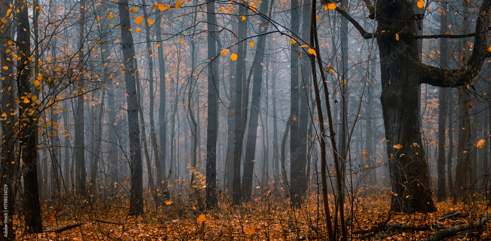 Atmospheric, beautiful forest on a foggy autumn day. Fairy, autumnal, mysterious forest trees with yellow leaves.