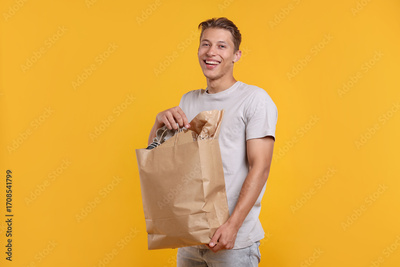 Recycling. Smiling man with bag full of different waste paper on yellow background