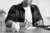 Piggy bank with coins on wooden table and man planning budget, selective focus