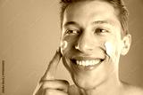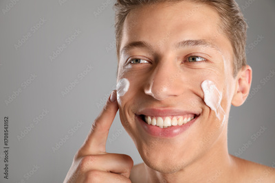 Handsome young man applying cream onto his face on grey background, closeup