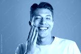 Handsome young man applying cream onto his face on grey background