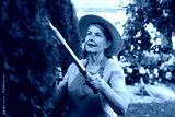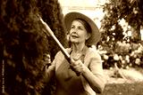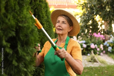 Senior woman in hat and apron with manual hedge trimmer working in garden