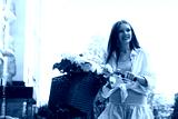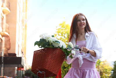Beautiful teenage girl near bicycle with basket of flowers on city street, low angle view