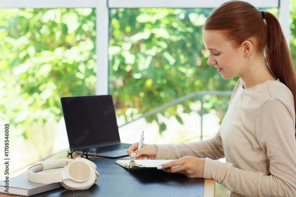 Teenage girl writing in notebook and using laptop at wooden desk indoors. Home workplace