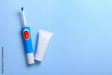 Electric toothbrush and toothpaste on a light blue background for personal dental care routine