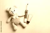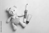 Playful arrangement of teddy bear, electric toothbrush, and toothpaste on soft pink background