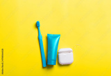 Bright blue toothbrush and dental care products on yellow background