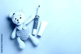 Soft teddy bear is ready for bedtime hygiene routine with electric toothbrush and toothpaste
