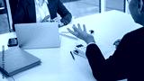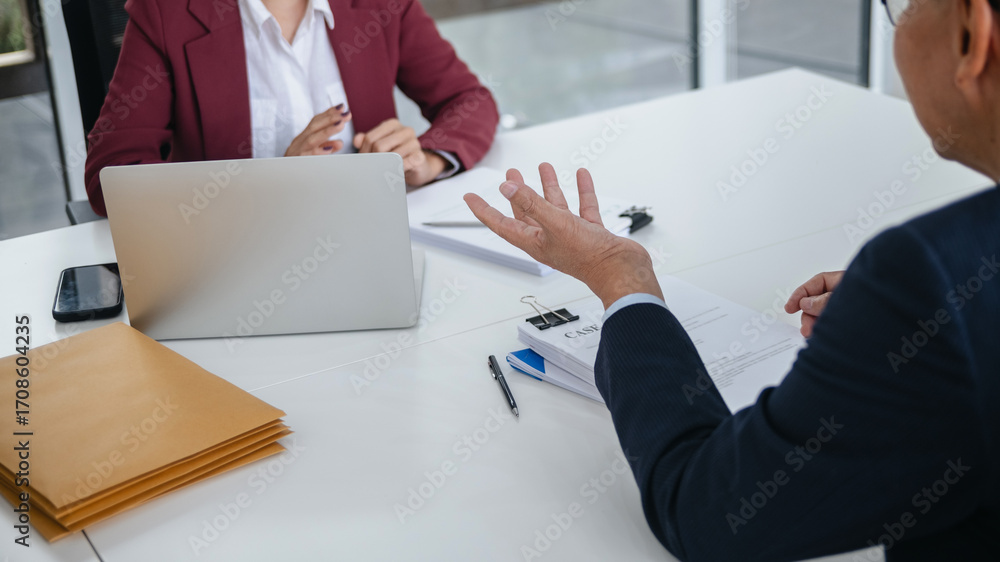 Attorney consulting clients in law firm office with professional discussion