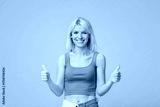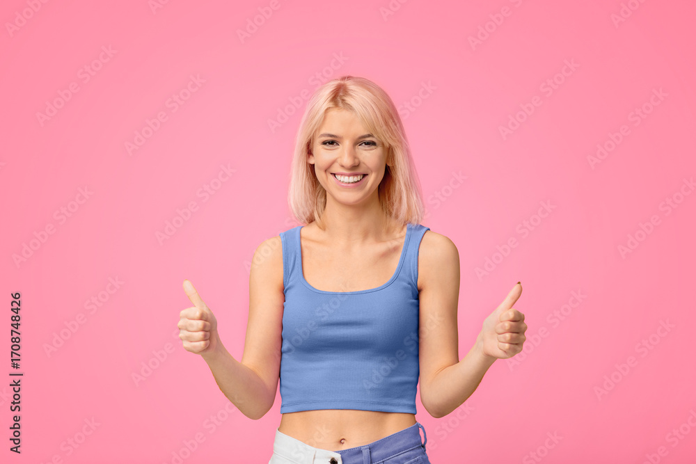 I like it. Overjoyed blonde lady gesturing thumbs up with both hands over yellow studio background. Fit woman posing and smiling to camera, demonstrating sign of approval